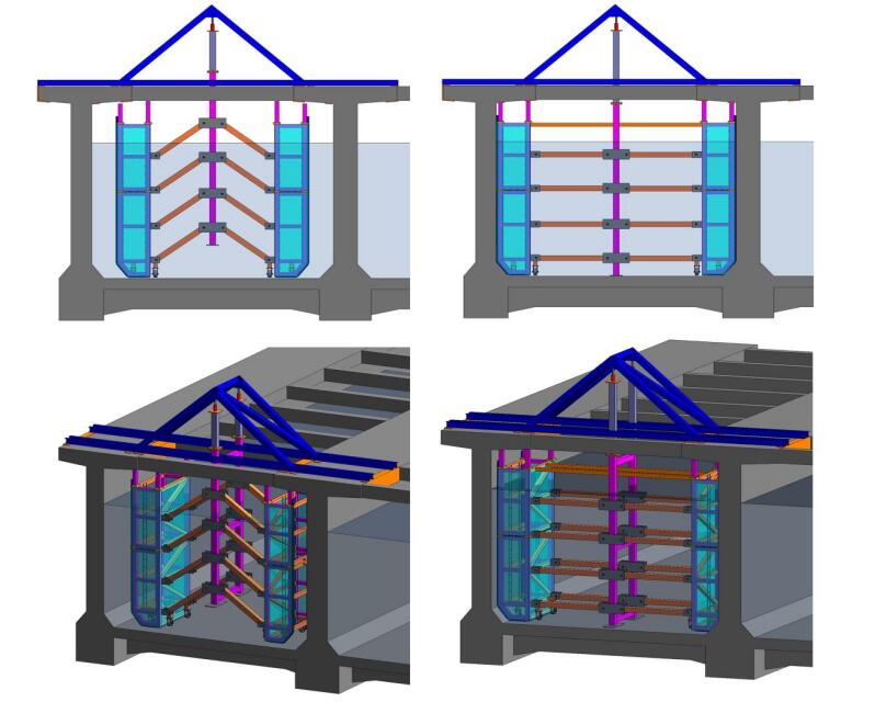 針對大型渡槽結構不中斷輸水施工,巨成結構研究開發了渡槽施工專用圍堰,通過可伸縮結構將兩側隔水箱連接,吊裝入水后張開貼緊側壁,通過高壓水帶形成密封隔水,再兩側隔水箱內水排干,形成干地作業環境,由此通過中間過水,兩側即可進行側壁修復。對于止水帶修復的情況,可先更換兩側隔水箱區域止水帶,再結合隔水膜將中間區域隔水,兩側過水,將中間區域形成干地作業環境。通過底部行走輪和側面限位輪,可通過牽引系統將隔水裝置在水下進行牽引行走,可做到連續施工。
