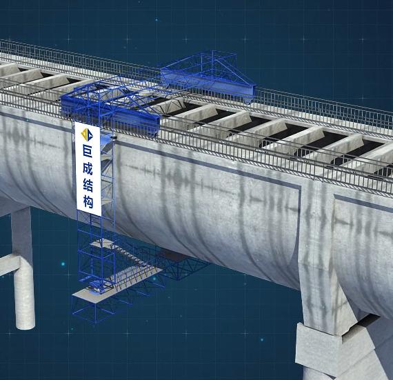 巨成渡槽檢修架車通過移動式平衡梁配合可伸縮式豎向垂直桁架,能夠使工作平臺沿平面及縱向兩個方向進行移動;豎向垂直桁架內側設有人員上、下通道及作業平臺。隨著檢修架車的移動,工作人員可逐步對渡槽槽身、槽墩進行全面檢測和維修加固。同時,工作平臺設計為可回轉形式,遇到槽墩等障礙物時可快速進行回轉運動,檢修架車便能連續行走作業。另外,側向限位裝置通過可調節彈簧,能夠確保檢修架車整體與渡槽槽身卡緊,保證了檢修架車在行進過程中的安全性。